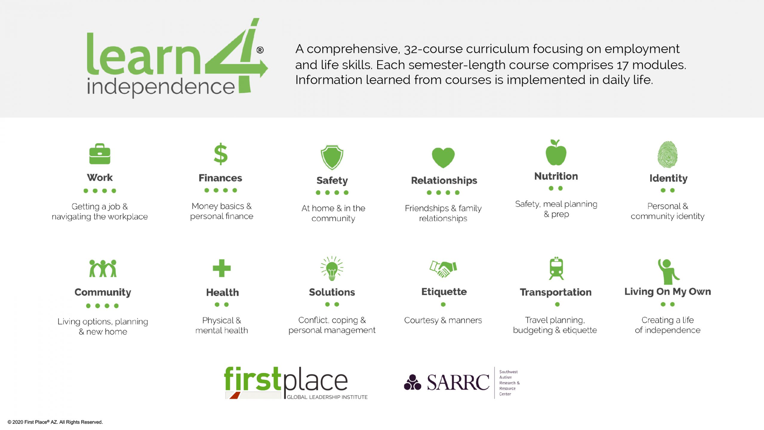 Courses include instruction in finances, safety, nutrition, community, health, etiquette, relationships, transportation, and problem solving skills.